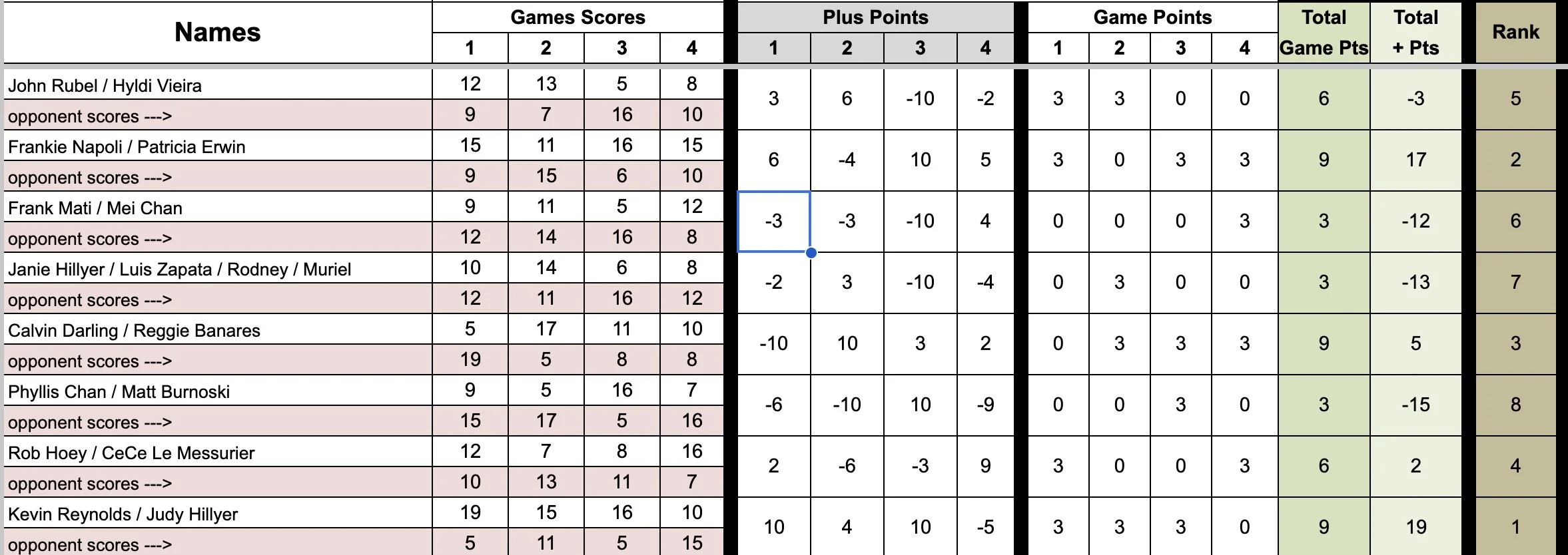 Saturday Tournament Results